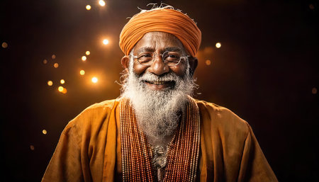 Portrait of smiling Indian senior guru wearing orange turban and traditional clothes