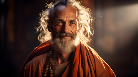 Portrait of an old man with a gray beard in an orange robe.