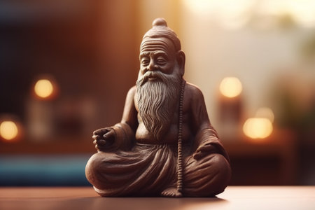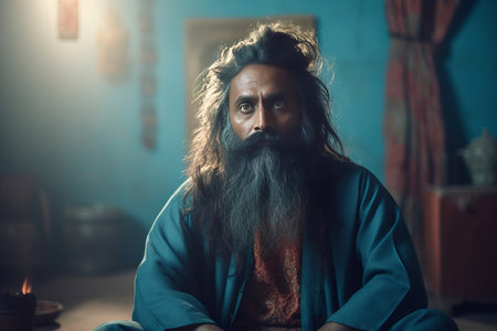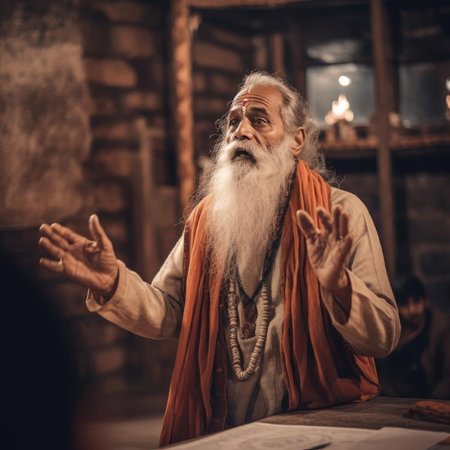 Indian elderly guru sitting talking pose. Sacred temple monk and spiritual sage teacher. Generate ai