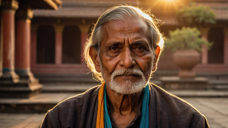 An elderly man with a gray beard sits contemplatively in a historic courtyard. Soft sunlight illuminates his face, highlighting his serene expression. Traditional architecture frames the background.