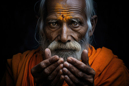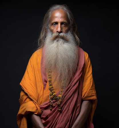 Portrait of a sadhu with long beard and orange robe on black background