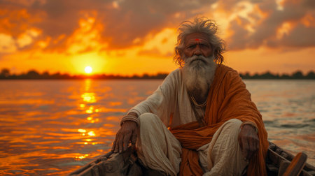 An elderly spiritual leader in vibrant orange attire sits by the river at sunrise, expressing deep spirituality through prayer. Serenity and peace envelop the scene.