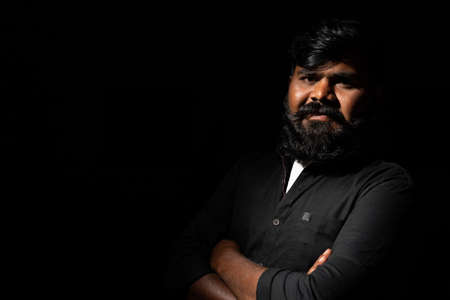 Young indain beardman with crossed arms standing against dark background - Conncept of self confident, positive emotion and happiness