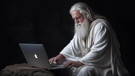 Modern Santa Claus Santa Claus working on laptop while standing against grey background : Generative AI