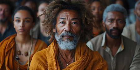partial view of spiritual mentor in white shirt and beads, banner