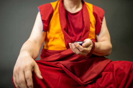 Buddhist monk holding a candle with a candlestick in his hand