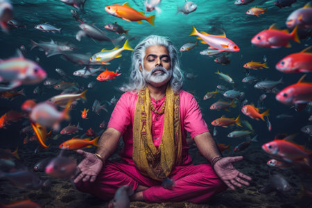 Guru meditating underwater fish. Interesting and funny human with colorful clothes. Generate AI