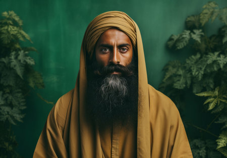 Sikh Indian man wearing traditional yellow turban. Studio portrait. Religion concept.