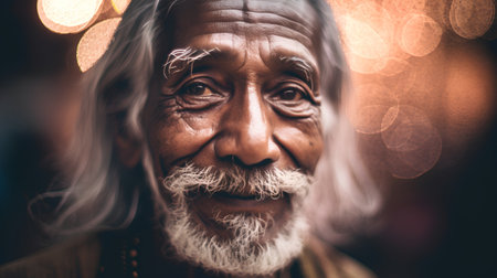 Old Indian man with white beard and mustache looking at camera with bokeh background