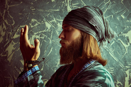 A man of oriental appearance, dressed in a robe and a turban, looks at his palms. Grunge background.