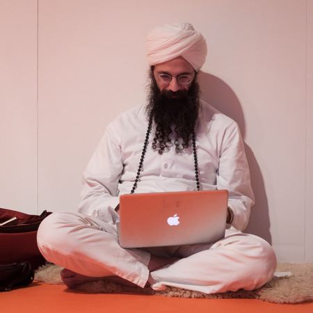MILAN, ITALY - FEBRUARY 7: Bearded man with turban works on his notebook at Olis Festival, event dedicated to holistic disciplines, alternative medicine and natural food on FEBRUARY 7, 2014 in Milan.