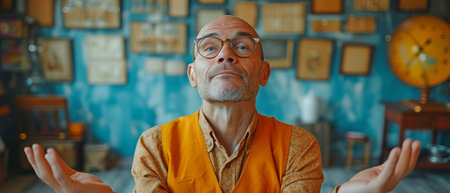 A bearded man with a bald head is praying in a temple