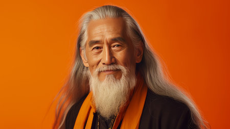 Portrait of an elderly handsome Asian senior man old with gray long hair, on an orange background, banner. Advertising of cosmetic products, spa treatments, shampoos and hair care products, dentistry and medicine, perfumes and cosmetology for men