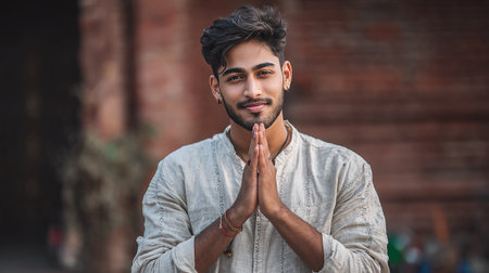 Portrait of a young Indian man praying in front of a brick wall