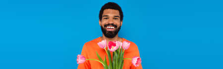 happy african american man holding pink tulips isolated on blue, banner