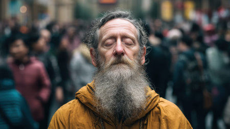 Elderly caucasian male meditating in busy urban street setting.