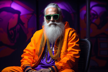 An elderly man with a wise expression stands against a striking gradient of fiery orange and mellow yellow. The highgloss background reflects the warm colors giving a sense of.