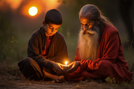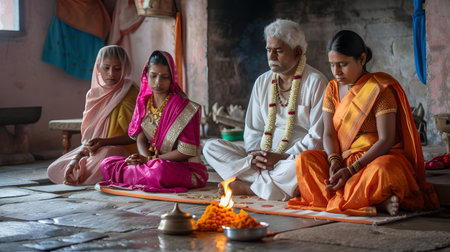 An Indian family in traditional attire engaging in a spiritual ritual with a warm glowing lamp. A.I.
