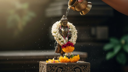 Hand pouring water on Buddha statue adorned with flowers, outdoor.
