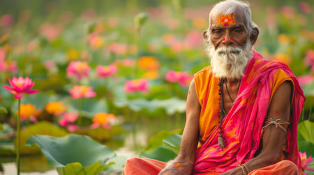 An elderly monk sits in meditation on a shore covered with pink lotus flowers, reflecting tranquility and peace.