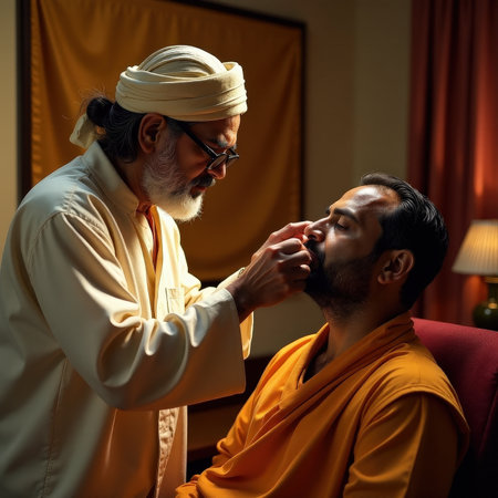 Mature Asian man conducting spiritual ritual with young Asian man in traditional attire.
