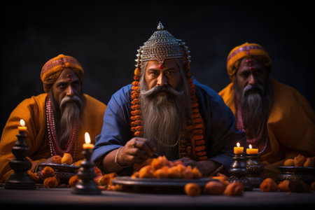 Indian men in colorful traditional attire sitting and participating in cultural event