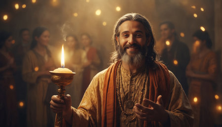 A wise elder contemplates ancient texts in a sacred space. The atmosphere is filled with devotion as people gather for new beginnings.