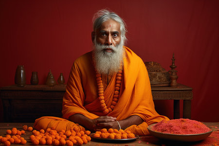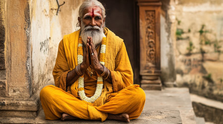 A serene holy man in orange attire sits peacefully with hands in prayer. His wise expression and traditional garlands reflect deep spirituality and culture.
