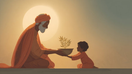elder handing sabzeh to young child, background filled with soft sunlight and warmth. Generative AI
