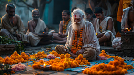 Elderly guru meditating surrounded by marigold flowers, a serene ritual scene with fellow devotees in a traditional Indian setting.
