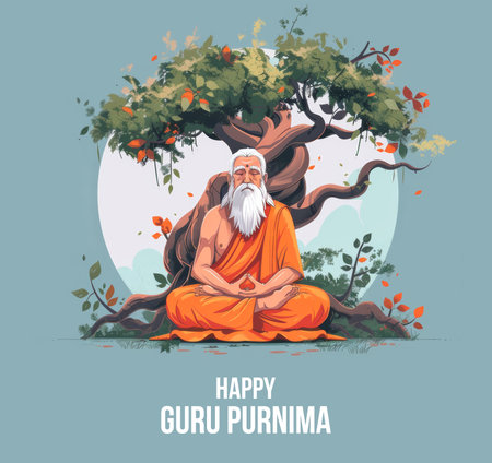 Vibrant illustration celebrating Guru Purnima with a serene guru meditating under a mystical tree, symbolizing wisdom and tranquility.