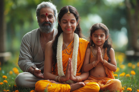 An Indian family sits in a Buddha pose on the grass in a park and meditates. Parinirvana day celebration concept. Copy space