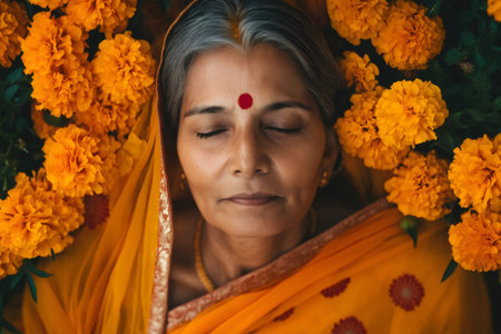 Portrait of a peaceful Indian woman with closed eyes, wearing a vibrant orange sari, lying serenely amidst a bed of bright orange marigold flowers