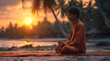 A young man sitting on the beach meditating in front of a sunset, AI