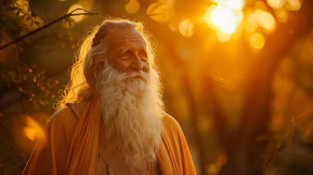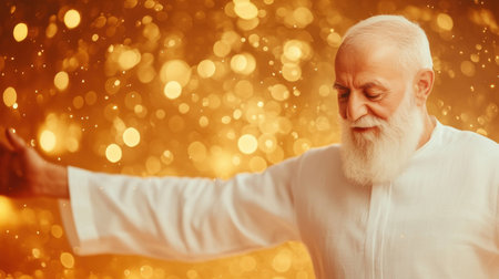 Joyful elderly man with a white beard, wearing a white robe, enjoying life against a vibrant gold bokeh background, symbolizing happiness and wisdom