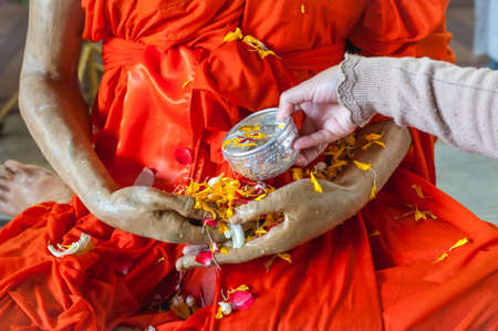 A hands sprinkle water to a Monk statue on Song kran day (Thai new year) at Wat Tepleela temple,Bangkapi district ,Bangkok Thailand