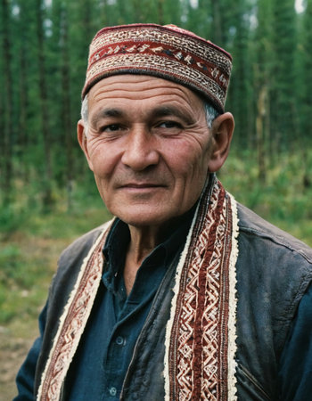 Elderly Kyrgyz man wearing traditional cap and patterned sweater, representing rich cultural heritage