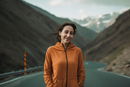 Young woman in orange sportswear standing on the road in mountains