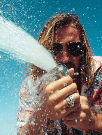 A man in sunglasses spraying water from a hose against a blue sky on the beach.