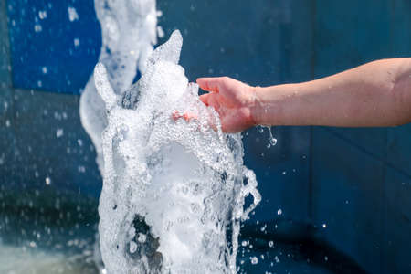 Hand touch the fountain. A stream of water from the fountain is touched by hand.