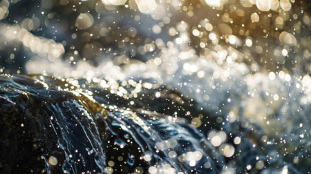 This close-up image captures dynamic water splashing over textured rocks in a stream, showcasing the beauty of nature and tranquility.
