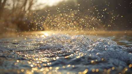 A dynamic close up shot of a sea wave splashing with water droplets in the air. The setting sun creates a warm glow over the water and a distant tropical shoreline.