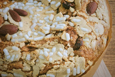 Dessert and Sweet Food, Close Up of Traditional Honey Cake Topped with Caramel, Resins and Almonds.