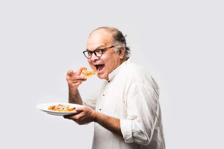 Indian asian senior or old man eating pizza while standing isolated against white background