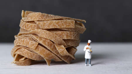 Close-up images of whole wheat pasta and a miniature chef. The miniature people and pasta noodles with Business concept.