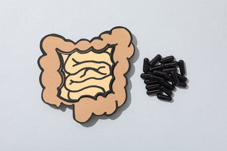 Creative idea of probiotics capsules or medicine pills absorbed in small intestine. Concept of digestive supplements, intestinal microflora and drug metabolism. Minimal style.