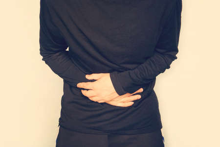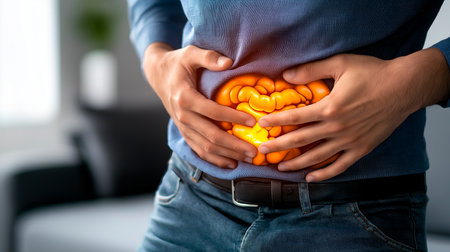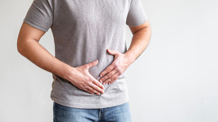 Man feeling abdominal pain and stomachache, a representation of digestive discomfort.