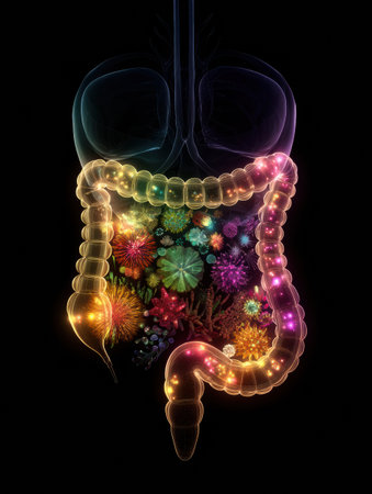 Digestion system highlighted with soft transparency showing colorful microbiome elements and their role in gut health under dark setting