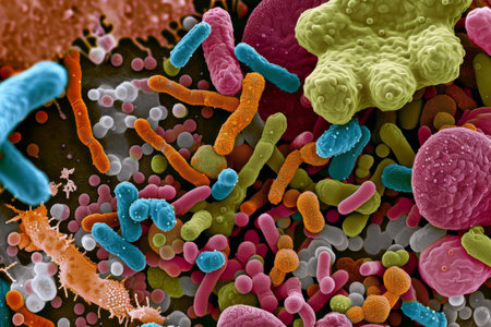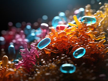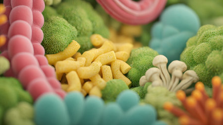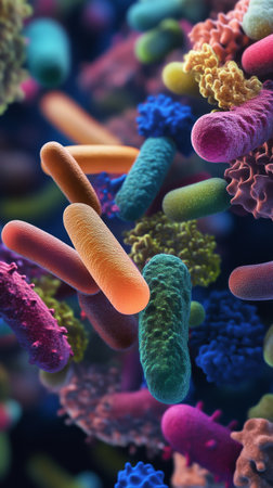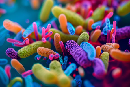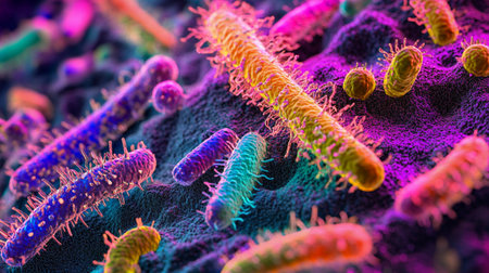 Colorful bacteria and microorganisms thriving within a human gut at the microscopic level