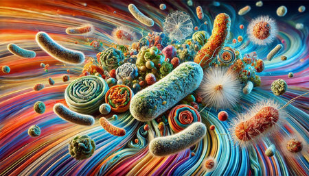 A vibrant and colorful illustration representing the microbiome, showing various microbes and cells interacting within a textured background. probiotics, gut health, and the immune system.